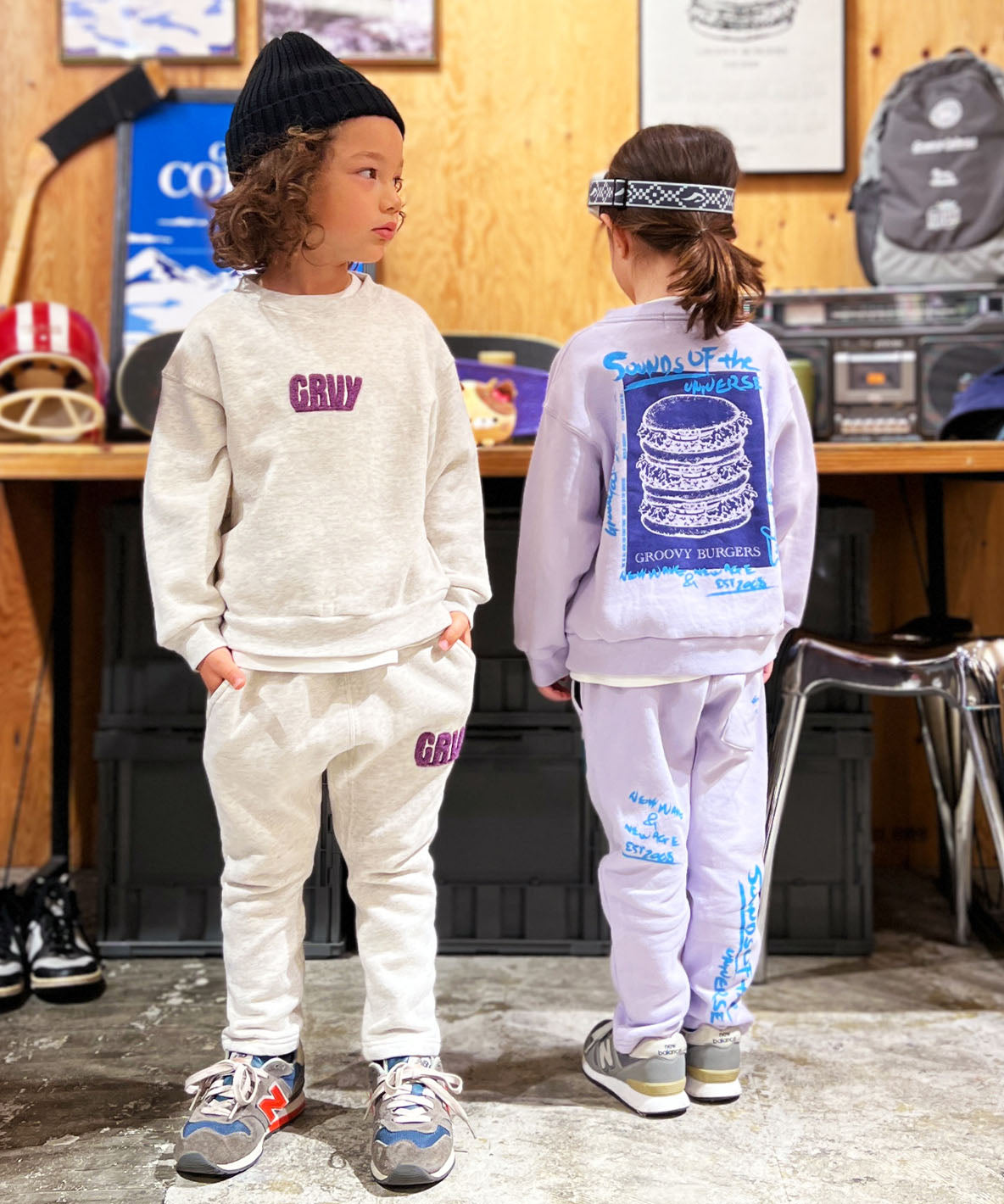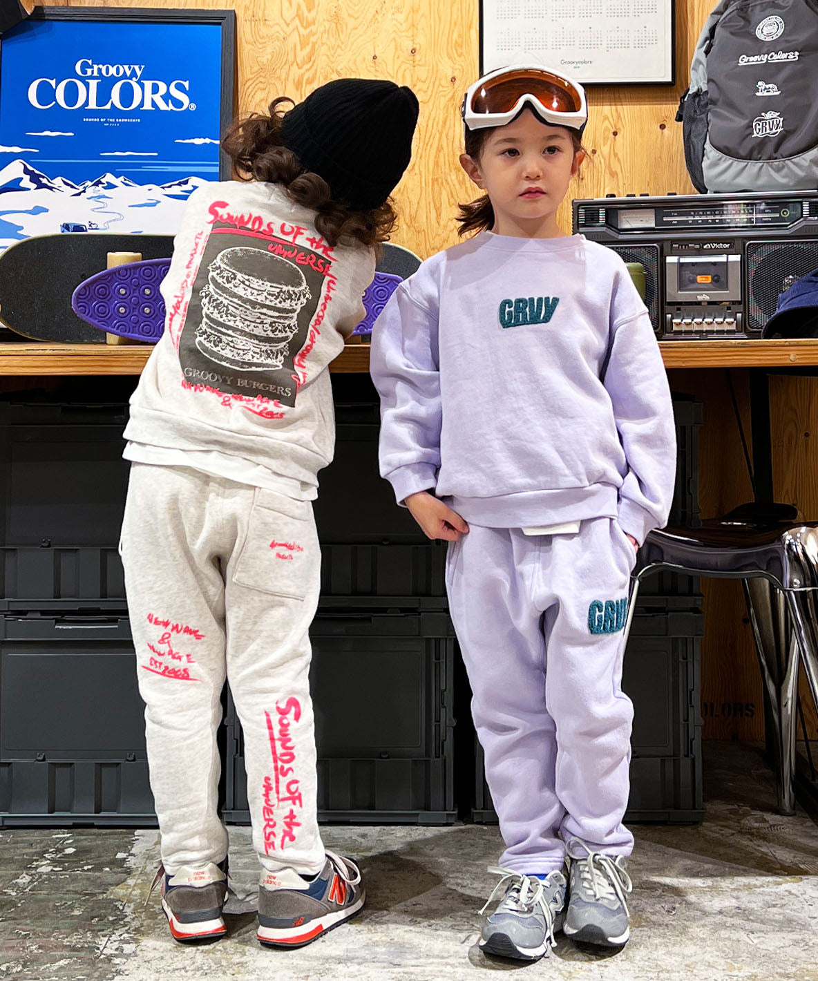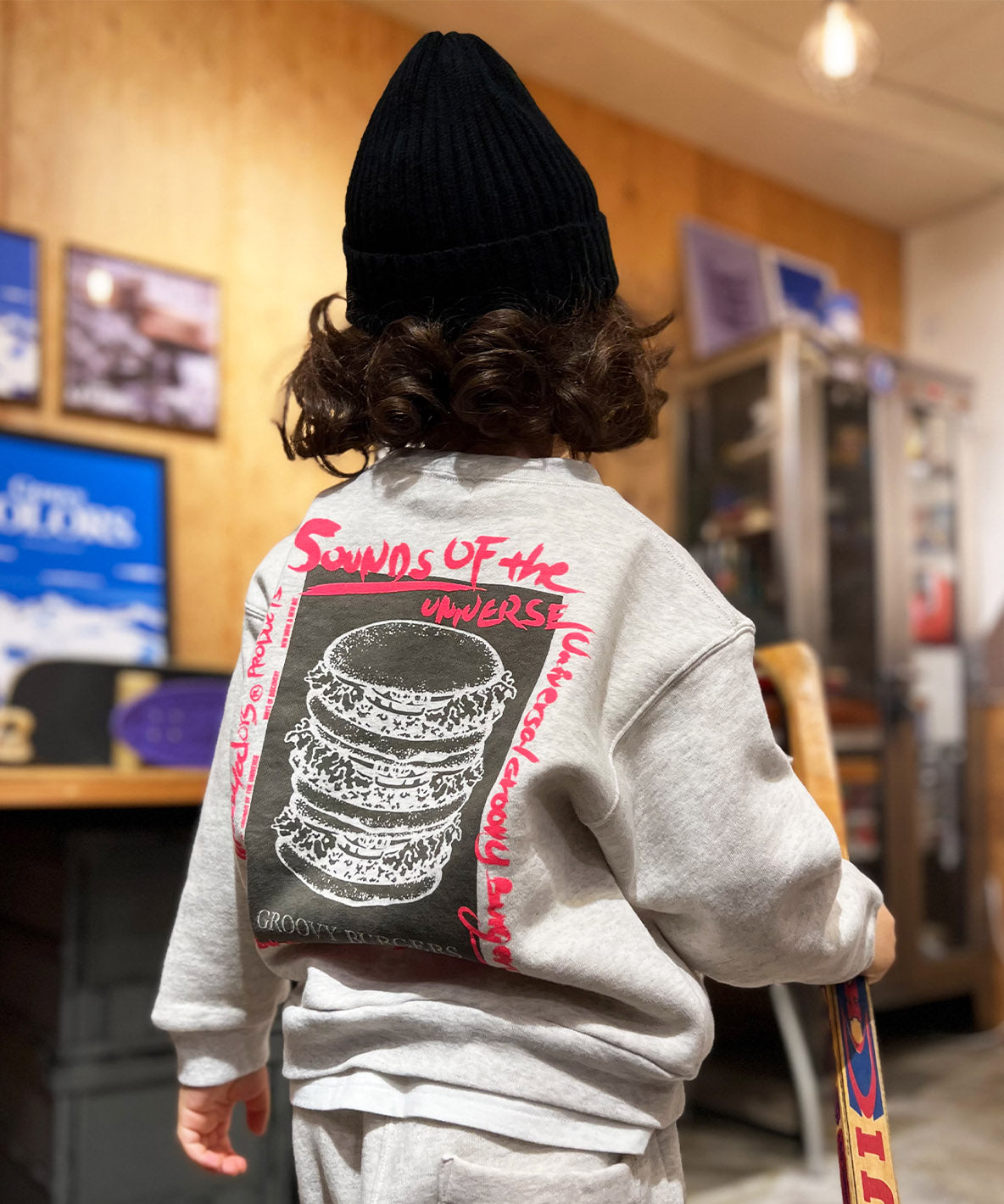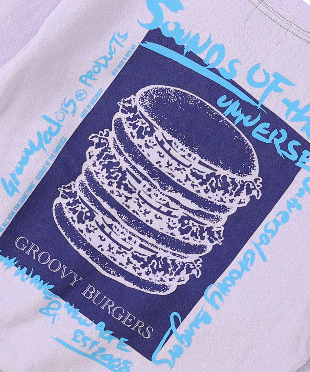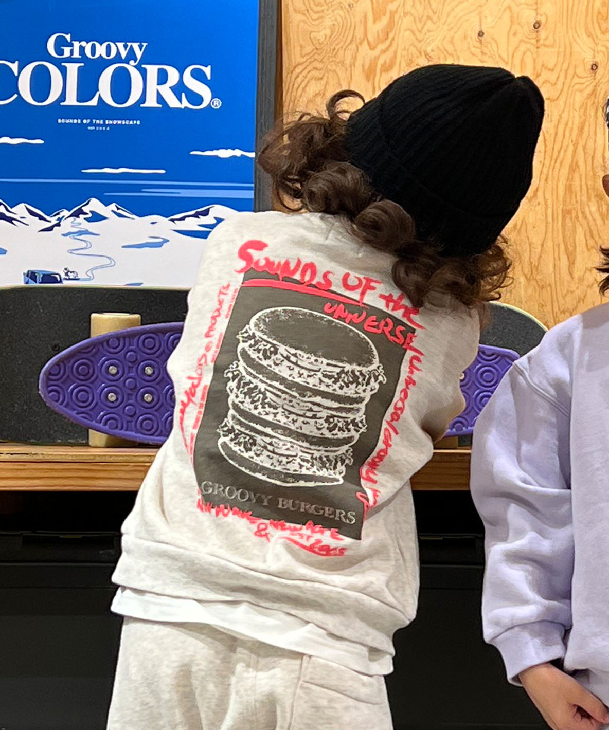 This crewneck sweatshirt is completed with warm and smooth pile material. It features GROOVY's basic semi-loose silhouette with the 3D Sagara embroidery on the front. The graphic logo is printed in fluorescent color around a hamburger in single color like a street art. Recommended for street style with denim bottom. Pair it with the top-and-botom set outfit ref no.42480530.