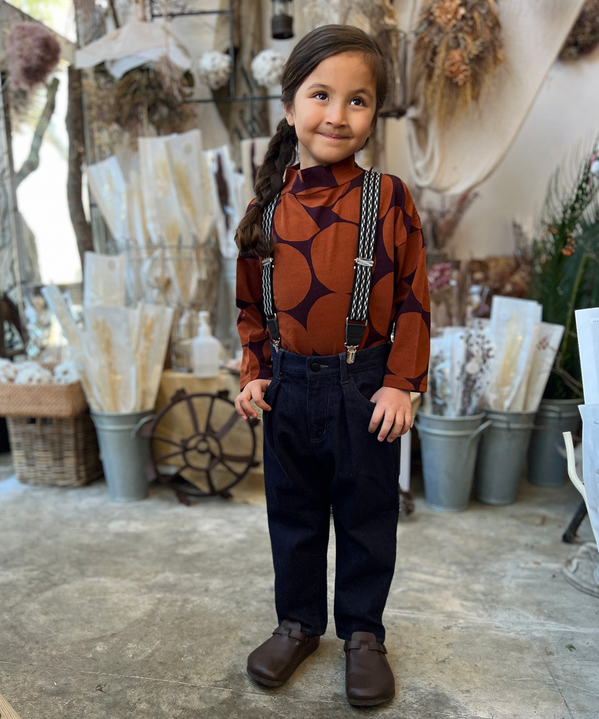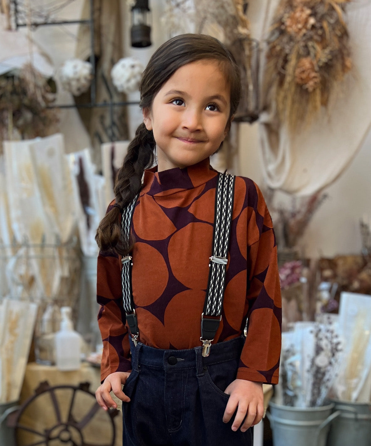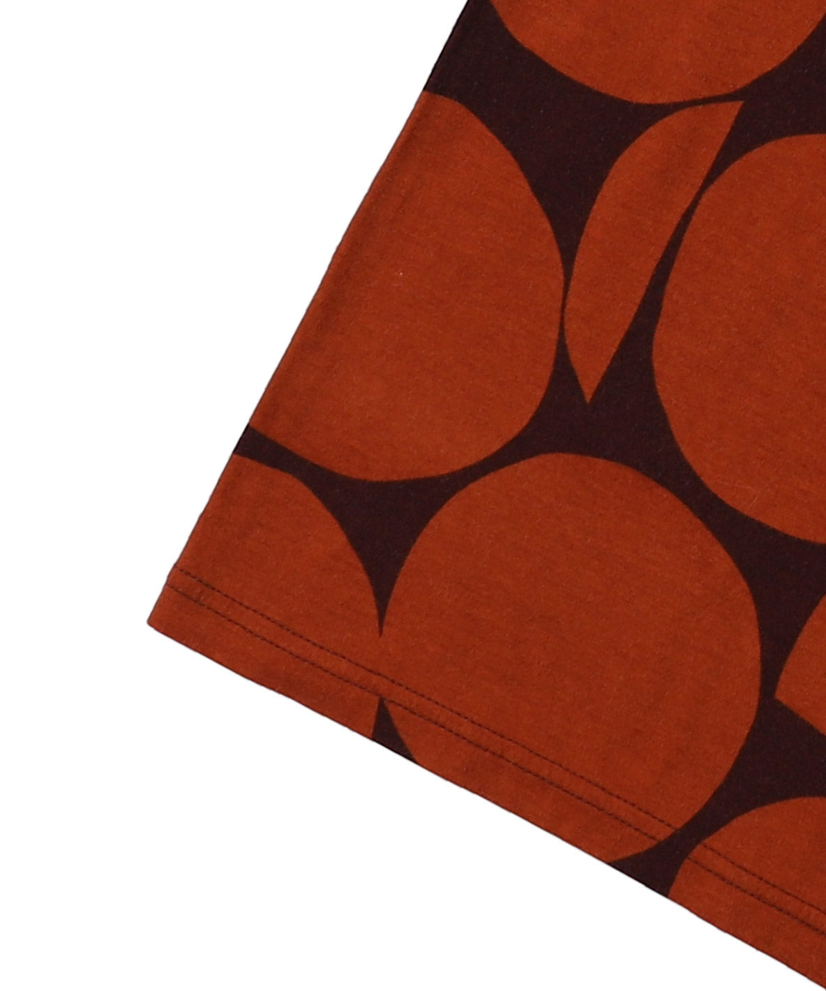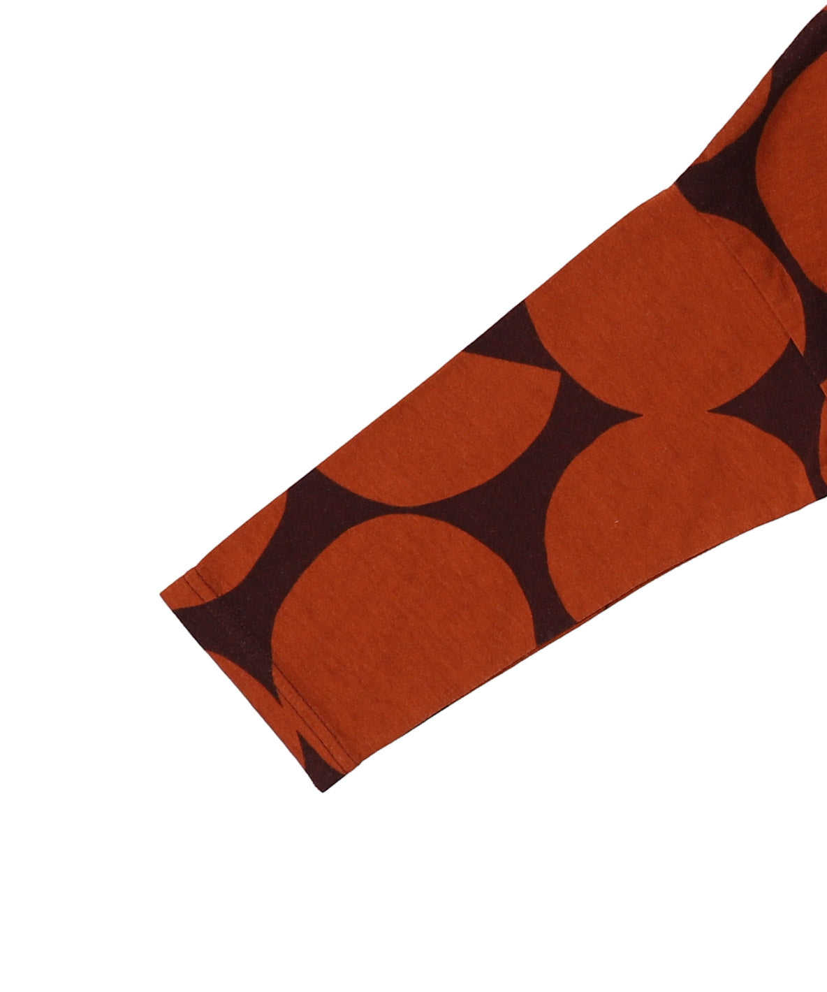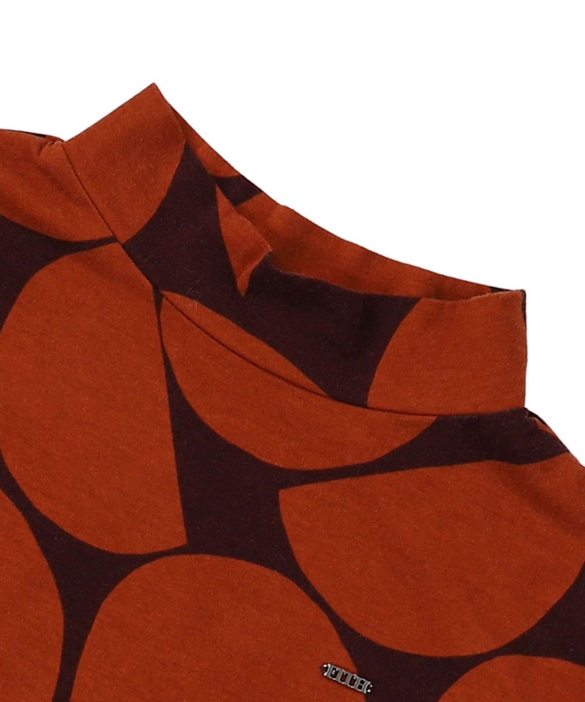 Mock neck design T-shirt. Printing big dot on cotton single jersey. This cotton jersey is woven with the elasticated polyurethane. Made in Japan. It can stretch horizontally and vertically. Recommend to wear it as an inner of your jacket. Perfect for the neat styling. This deep coloring matches with fall and winter.
