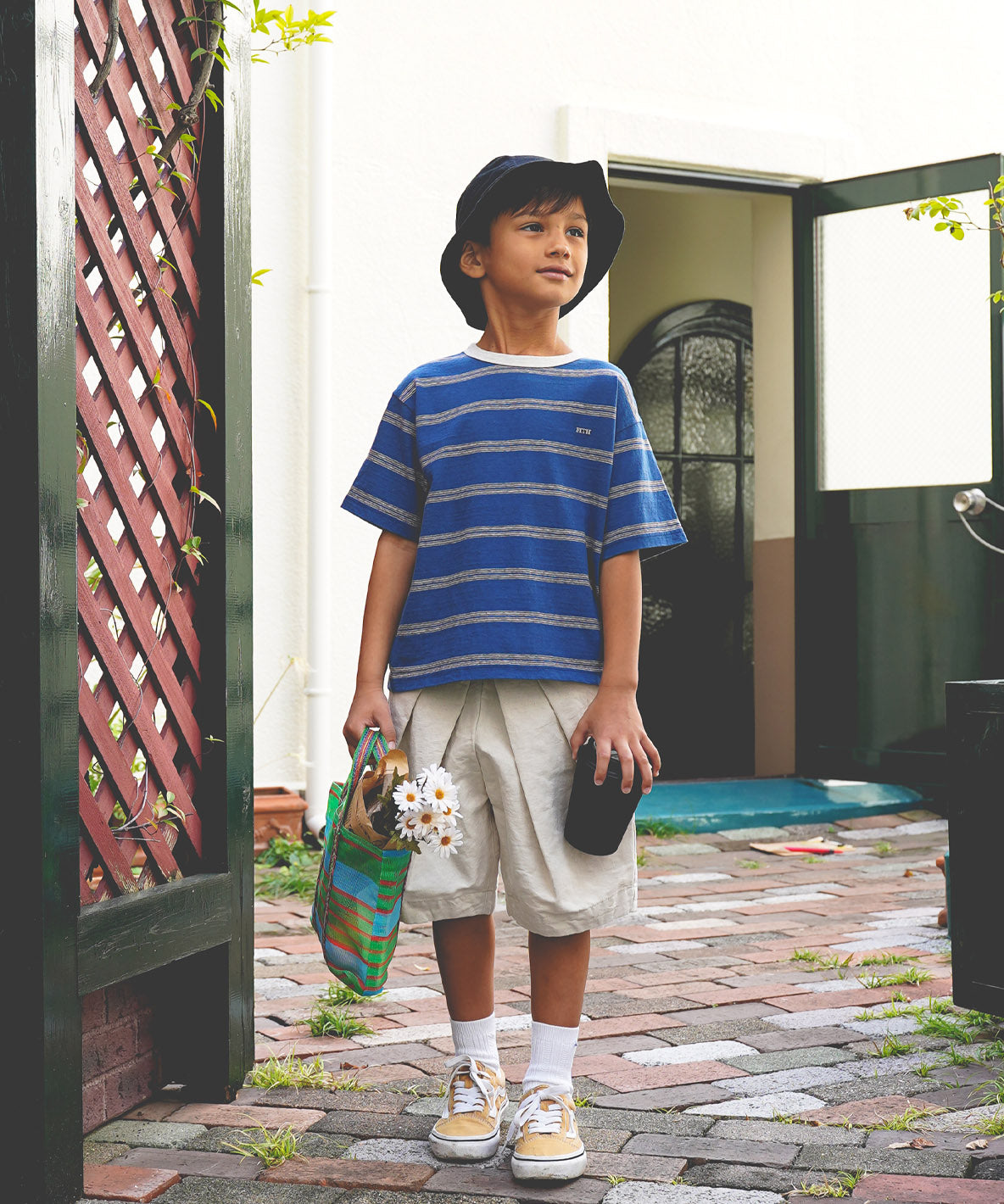 This striped T-shirt is completed with the sustainable material using 20% of the recycled, 19/-count supima yarn. It is made and manufactured in Japan. This fluffy striped material is completed with natural uneven yarns. Completed as semi-loose silhouette short sleeve T-shirt.