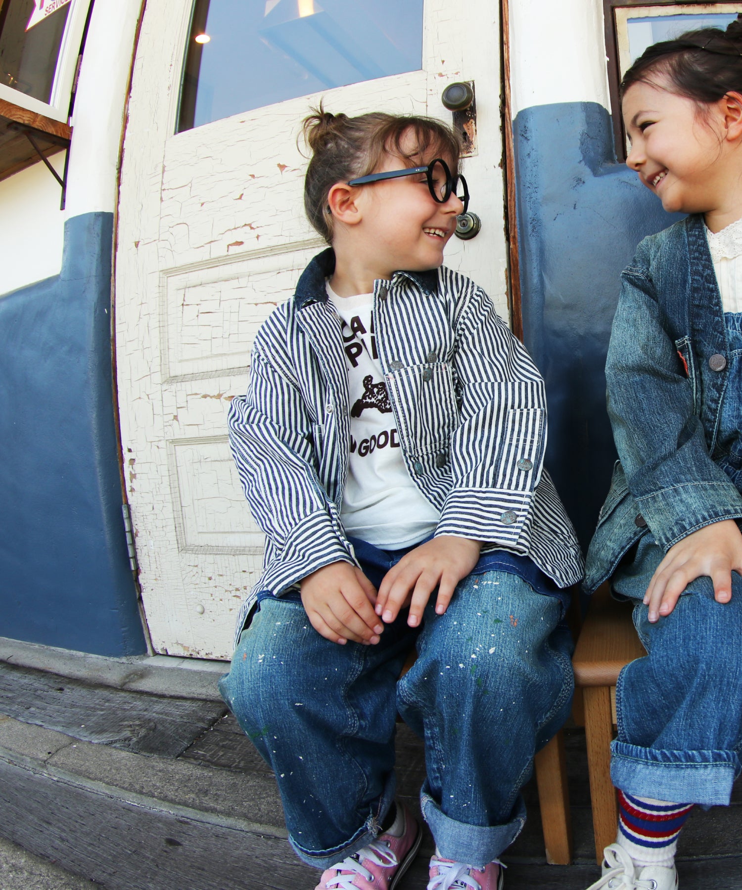 This hickory jacket is designed with double-breasted style. It features red embroideries on the back style. These embroideries are designed like embroidering with the manual sewing machine and inspired by wears for railroad workers in the 1950s.