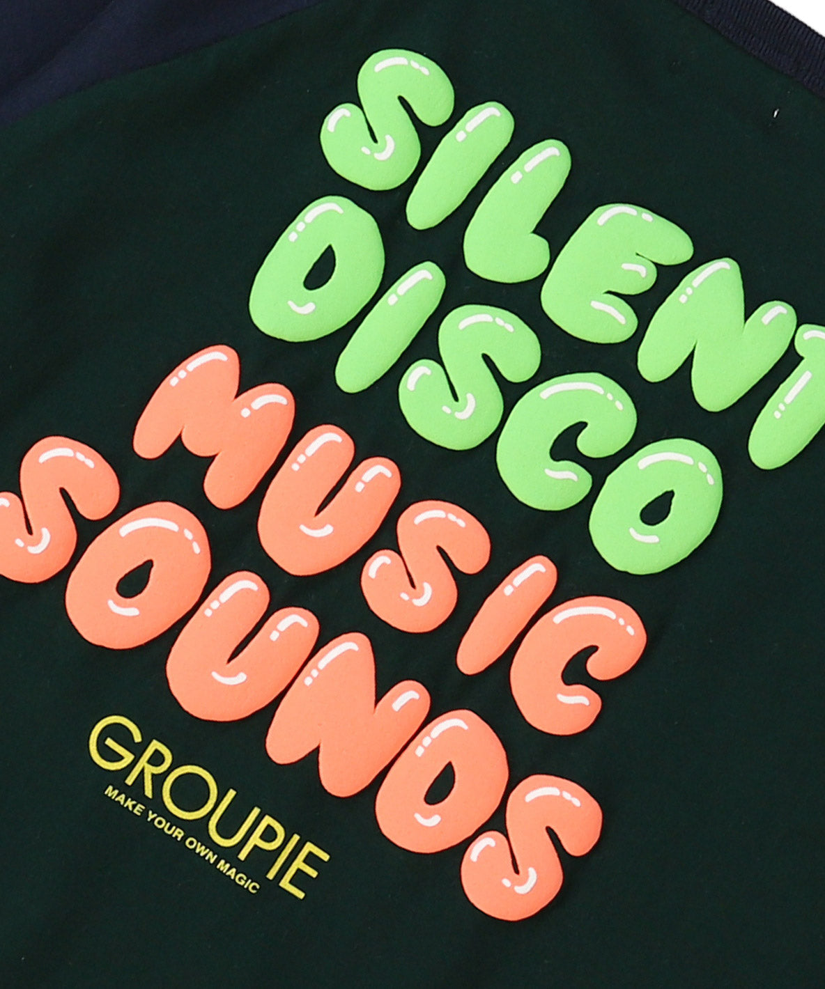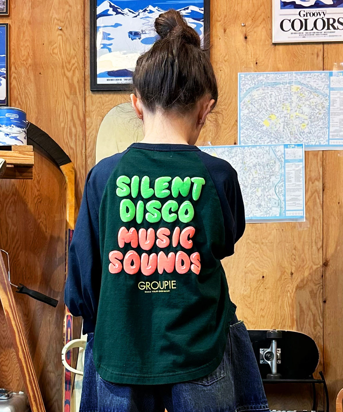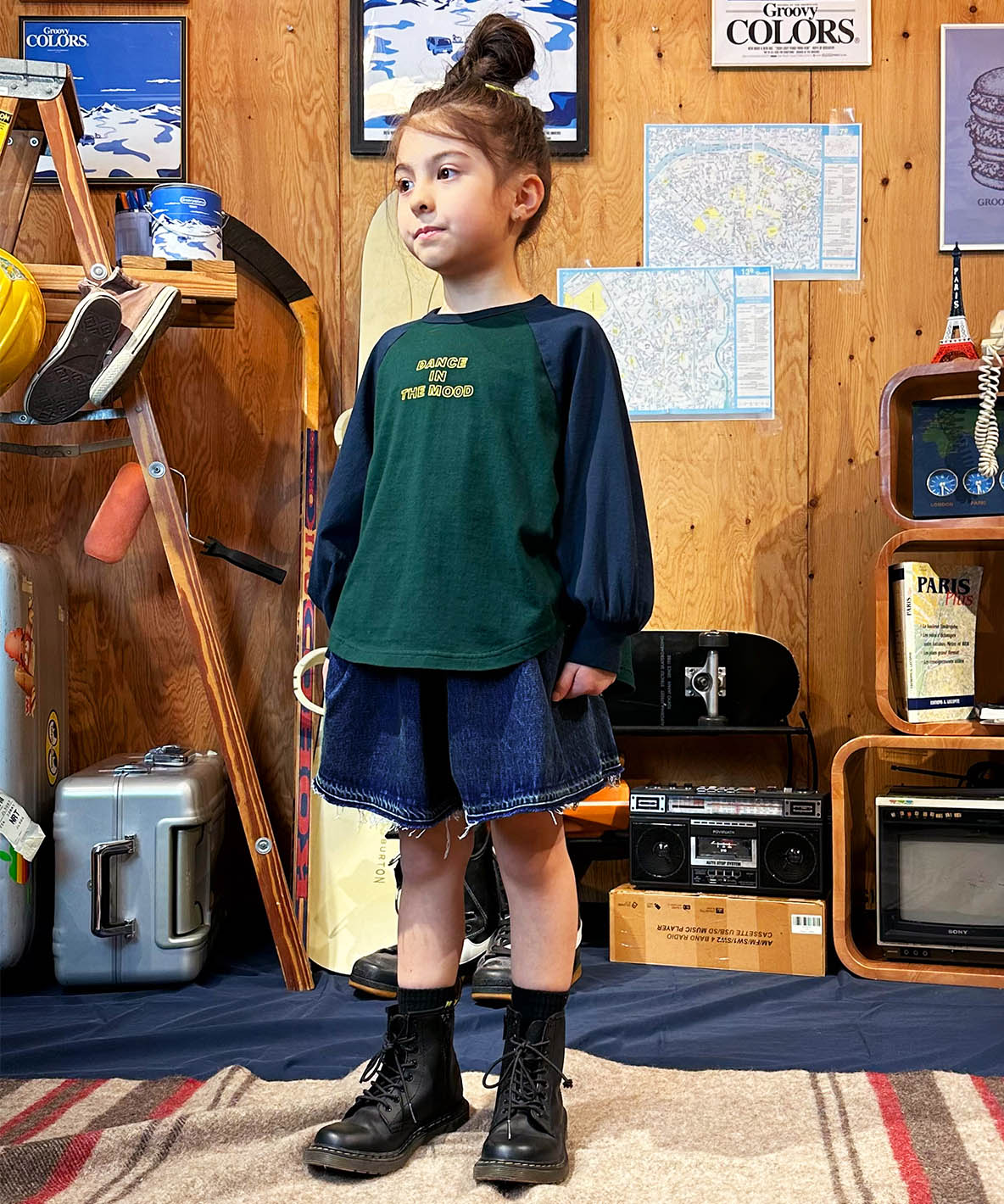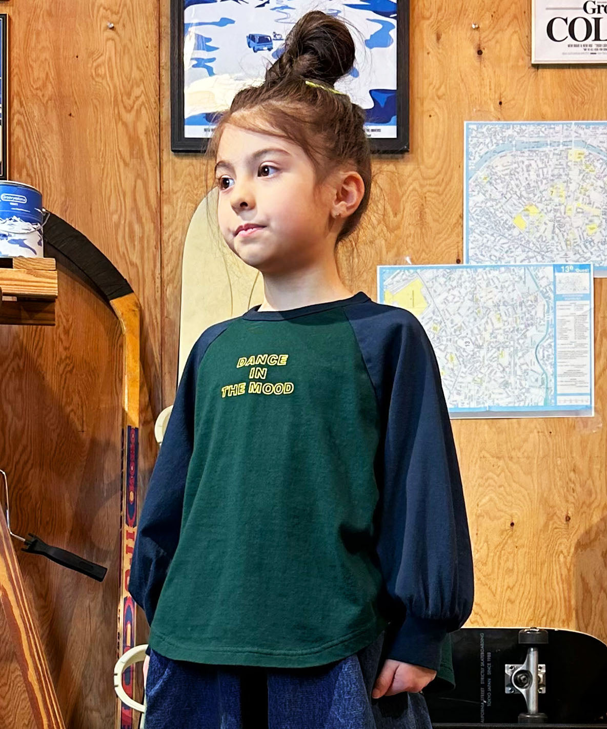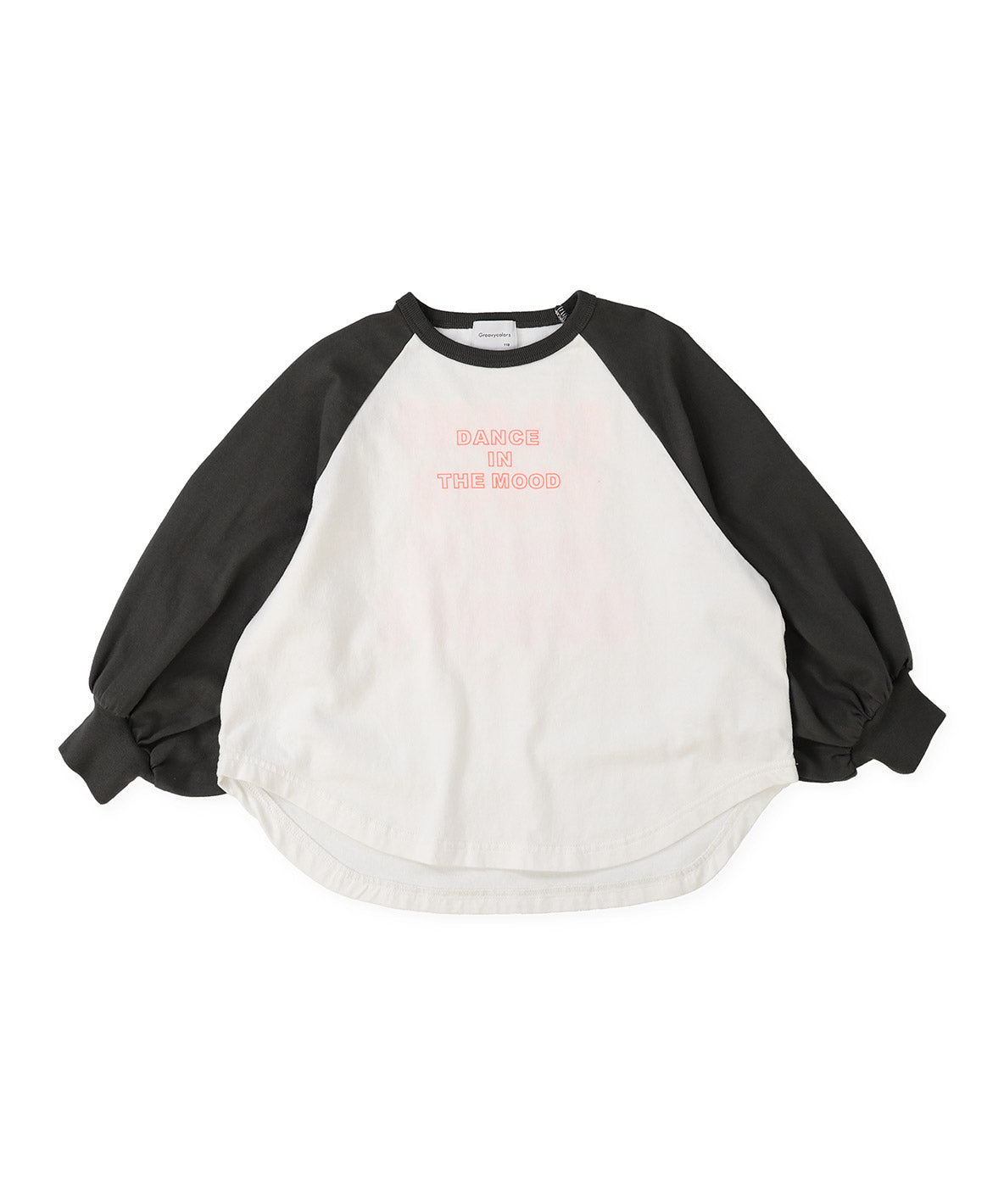 Wide and long raglan T-shirt. Using 40/2 cotton jersey fabric. Looks girly with widely gathered sleeves. Cute plumpy printing with fluorescent color on the back.